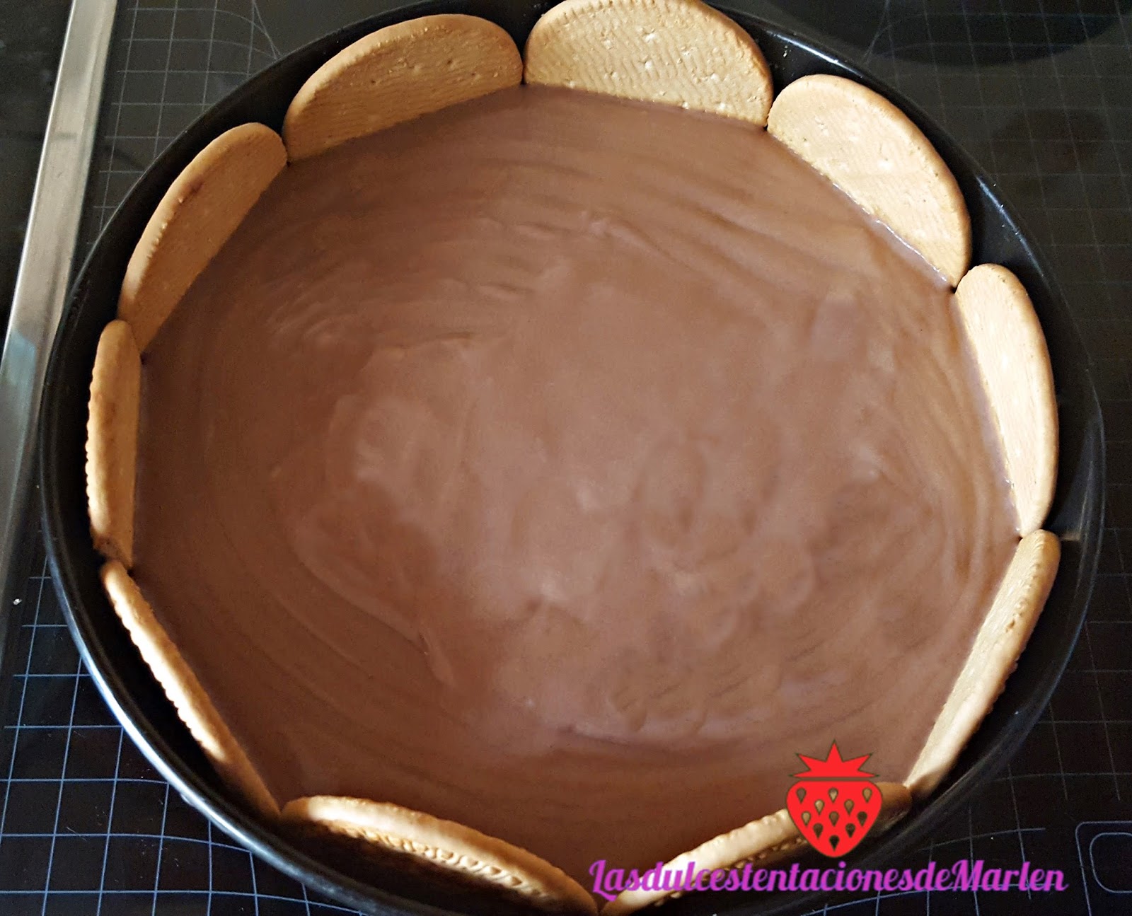 Poco a poco añadimos también la mezcla de leche con la gelatina mezclando sin parar intentando que no se baje la mezcla.Añadimos la mezcla con cuidado sobre la base de galletas en el molde y lo metemos en el frigo para que cuaje. Dejamos cuajar 2 horas