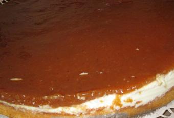 Colocamos la base del bizcocho en un molde desmontable, echamos el almíbar.
