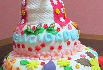 Pinchamos el tronco de la muñeca, sobre el bizcocho pequeño ya forrado de fondant, y le vamos decorando el vestido, cortamos la flores y se las vamos pegando a los dos pisos de la tarta.