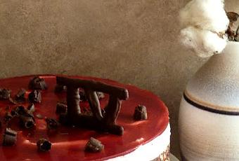 Capa de gelatina de frutas del bosque: hidratamos la gelatina en un poco de agua fría. Escurrimos y se la ponemos a los 100 gr de pulpa de fruta azucarada, calentamos unos segundos en el microondas y vertemos con cuidado sobre la capa de mousse.Llevamos a la nevera unas horas o de un día para otro. Desmoldamos, le quitamos la cinta de acetato y ponemos en el plato de presentación. Decoramos con unas virutas de chocolate.