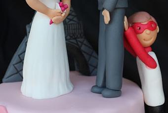 Esta tarta nos la pidieron para una boda, querían a los novios, París, y un ladrón robando la cartera al novio, son muchas cosas para incluir en una tarta tan pequeña, se hizo lo que se pudo, espero que os guste.