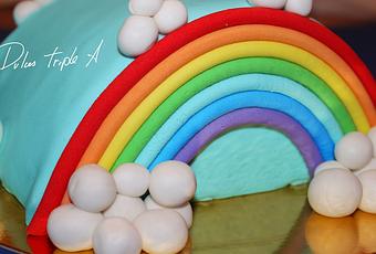 - Necesitaremos fondant celeste, para cubrir la tarta, blanco para hacer las bolitas en forma de nubes y rojo, naranja, amarillo, verde, celeste o índigo, azul y violeta.