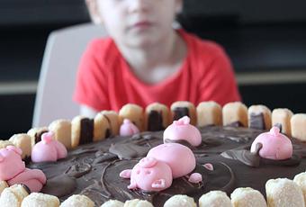 - cuando el chocolate esté aún líquido, ponemos nuestros cerditos en la parte superior de la tarta y dejamos secar