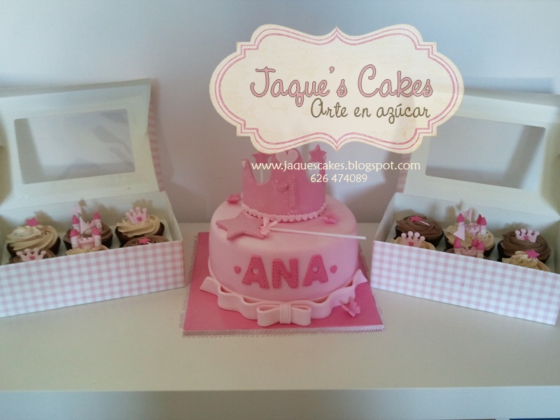 Cuando me llamó tenia muy claro el motivo de la tarta, para una princesita, tenia que ser una tarta de princesa.También nos encargó cupcakes decorados con nata vegetal y mini castillitos, varitas y coronitas... Todo en tonos rosa para su princesita.