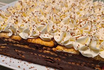 Forramos el molde con papel de horno, vamos pasando las galletas por la leche, solo hay que remojarlas unos segundos, no queremos que queden demasiado blandas. Ponemos una capa de galletas en el molde y cubrimos con una quinta parte de la crema, procedemos de la misma forma hasta acabar con la crema, la última capa debe ser de galletas. Cubrimos con papel film y llevamos a la nevera hasta el día siguiente.