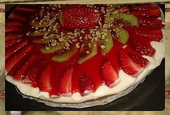 Trascurrido este tiempo, bajamos al frigorífico y dejamos otra dos horas más para que termine de cuajar. Una vez que la tarta ya está cuajada, vamos a proceder a decorarla. Yo he elegido las fresas y los kiwis, porque junto con el sirope de frutos rojos hacen para mi, una mezcla idónea. Cortamos las fresas por la mitad y luego estas mitades en juliana y los ponemos en la tarta cubriendo su parte exterior del circulo. A continuación, cortamos el kiwi en medias rodajas y hacemos con él otro círculo que cubra la tarta. En el centro, siempre me gusta acabar con una fresa.