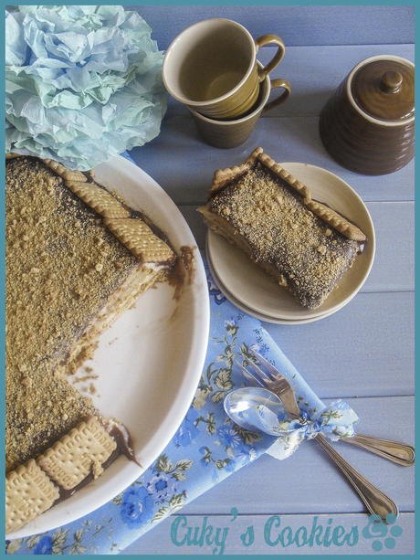 Seguro que ya habréis oído hablar de esta tarta alguna vez. Es muy típica de aquí, de nuestra Tierrina, pero también la he visto en algún sitio más. Es muy sencilla de hacer, para esos momentos en los que queréis hacer una tarta y no tenéis tiempo, además, pueden ayudaros los peques, (a mí de pequeña me encantaba entafarrarme las manos con todo...Si llego a tener que mojar galletas en leche para una tarta, no sé si hubiese quedado alguna en pie por aquel entonces...Ahora también me costó. La primera tanda quedó muy remojada, y no las iba a tirar. Eso era sacrilegio).También tengo que decir que pensé un poco en el niño-grande al hacer esta tarta, ya que es un enamorado de la crema pastelera y todo lo que la contenga.No esperéis fotos de Cuky soplando las velas, no le gustan, (será porque nunca acaba de apagarlas todas y les acabó cogiendo manía). Pero sí os dejo una foto del peluchito todo feliz después de zamparse media tarta =)