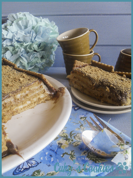 Volvemos a mojar las galletas una a una, y hacer otra capa de galletas sobre la de crema, y repetimos el proceso poniendo otra de crema por encima. Podemos poner las capas que queramos, (incluso podemos hacer una torre de Pisa de tarta...¿Os imagináis? O_O).