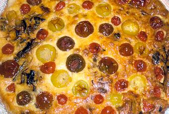 Los tomates cherrys son la forma más antigua de los tomates, son los que crecen de forma salvaje en disitintas zonas de América y hasta no hace muchos años se utilizaba sólo como elemento decorativo. De hecho ahora mismo los elegimos para nuestros platos porque son muy vistosos, pero debemos saber que tienen las mismas propiedades que cualquiera de las otras 10.000 variedades de tomates. ¿A que impresiona? Yo los uso desde la primera vez que los ví aparecer en la frutería. bien aliñados son una aperitivo fantástico, y en una tarta como esta también. ¡Os dejo la receta!