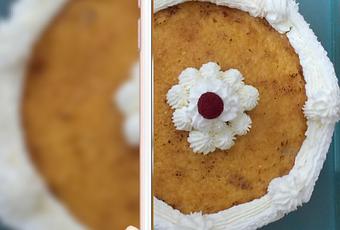 Ahora vamos a montar la tarta, dividimos el bizcocho en tres partes, bañamos cada parte con el almíbar, cubrimos una capa de bizcocho con el frosting de cacao, colocamos otra capa de bizcocho, que cubrimos con el frosting de nata, colocamos la última capa de bizcocho que cubrimos con la crema de yema, espolvoreamos azúcar por encima y quemamos con el soplete de cocina, decoramos con el frosting de nata restante la tarta por alrededor y encima de la yema tostada.