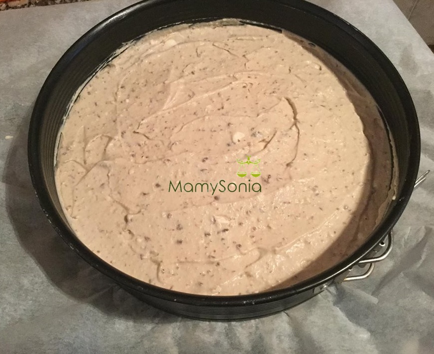 Volcamos a un molde desmontable de unos 20 cm, cubrimos la base presionando para que nos quede bien compacta, llevamos al frigorífico durante una hora.