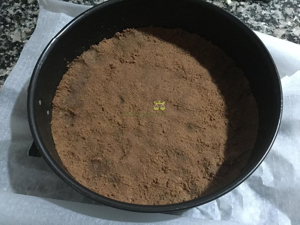 Volcamos a un molde desmontable de unos 20 cm, cubrimos la base presionando para que nos quede bien compacta, llevamos al frigorífico durante una hora.