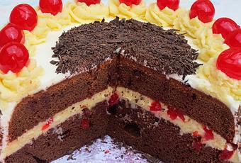 3- Cubrir con la nata montada, adornar con los copetes de crema de mascarpone, chocolate rallado y guindas enteras.