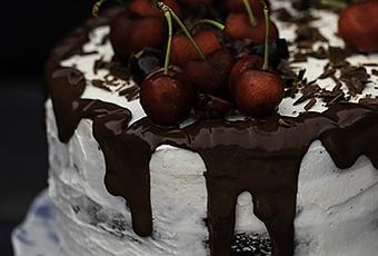 Spread half the cherries on the cake and top with 1/3 of the whipped cream frosting.