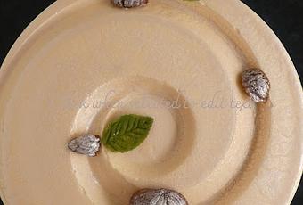 Pasamos a un plato de presentación. Decoramos poniendo encima, castañas pintadas con polvos plateados comestibles y hojas de chocolate de modelar.
