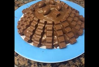 Ahora ponemos en el borde de toda la tarta las barritas de Kinder chocolate hasta completarla y le atamos un lazo para que cuando se endurezca la Nutella quede bien pegado.