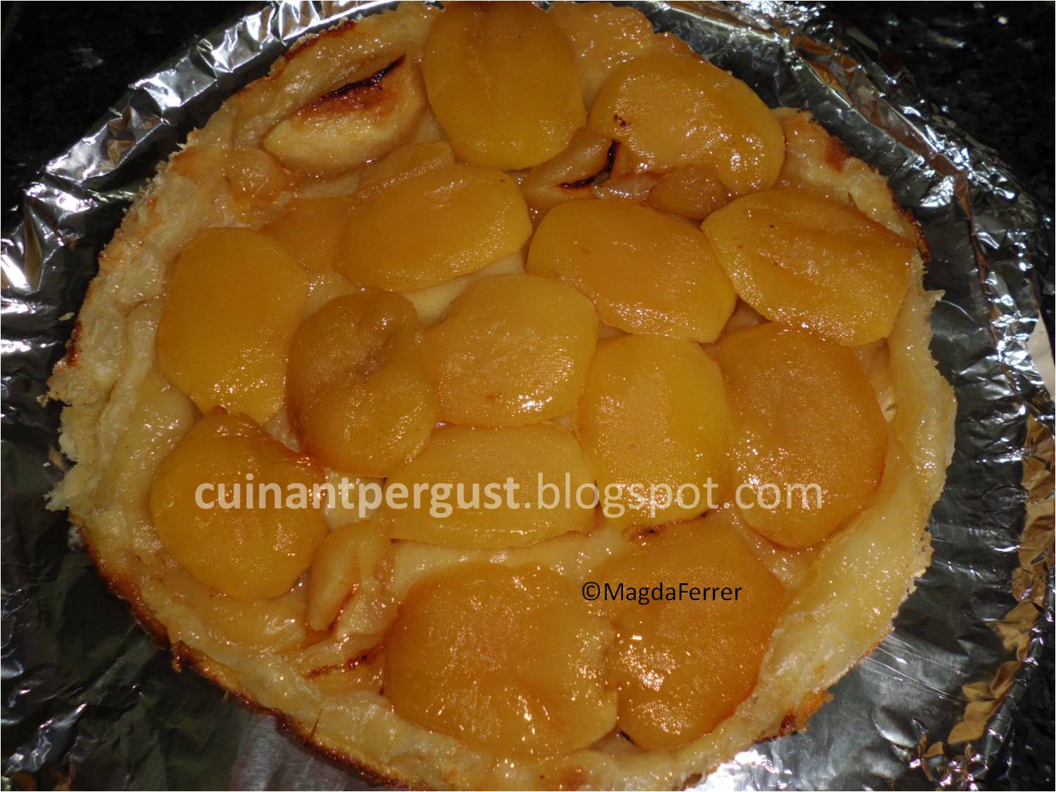 Ingredientes:4 ó 5 manzanasAzúcarMantequilla1 lámina de hojaldre1 huevoElaboración:Tarta Tatin una vez se le ha dado la vuelta