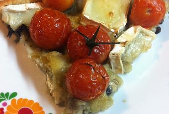 Se disponen los tomatitos junto la salsa encima de la masa de hojaldre con los tomates, se agrega el racimo de tomatitos reservado y se añade una pizca de aceite por encima. Se introduce en el horno durante 15 minutos.