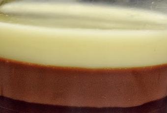 Capa de chocolate negro:Se separa medio vaso de la leche y se disuelve el sobre de cuajada.Se ponen a hervir los 250 ml de nata y el resto de la leche junto el azúcar.Se añade el chocolate y se remueve hasta que se derrite.Se añade la cuajada disuelta en leche y se remueve hasta que hierve (2 o 3 minutos).