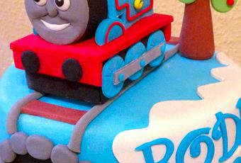 Le ponemos delante dos circulitos negros que lleva y hacemos como otra chimeneita azul, hacemos seis ruedas y se las pegamos, y unas medias lunas azules con una bandita roja que ponemos a ambos laterales encima del fondant rojo.