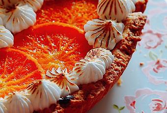 Para comenzar esta semana con alegría he preparado una exquisita tarta de naranja, la base es una masa quebrada, y el relleno es una crema inglesa de naranja, Orange curd, todo ello decorado con rodajas de naranja y merengue de coco. No se os hace la boca agua?