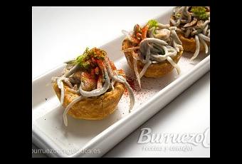 Extender la lámina de hojaldre y con ayuda de un aro cortar en círculos la masa para preparar las tartaletas. Colocar el hojaldre recortado en una bandeja de moldes para muffins y cubrirlo con garbanzos para que no suba. Hornear a 180ºC con horno precalentado durante 8-10 minutos. Sacar, dejar enfriar, retirar los garbanzos y desmoldar.