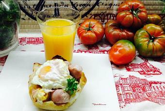 Rellenamos cada uno con 2 rodajas de bacón, 1 huevo y la salchicha troceada.