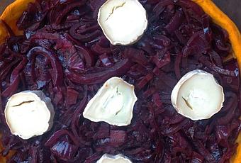 - Sacamos la tartaleta y rellenamos con la cebolla. Yo le añadí unos trocitos de queso de cabra que daban sabor y color estupendo.