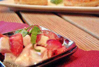 Rellenamos las tartaletas que ya tenemos hechas y frias o sobre la cucharita o plato de aperitivo, aliñamos, ponemos un poco de albahaca picada y unas escamas de sal.