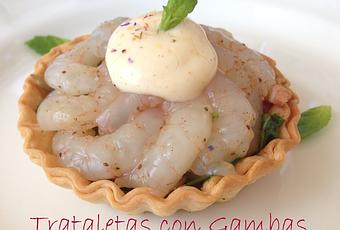 Sobre cada tartaleta colocamos un par de cucharadas de la ensalada y sobre ella una cucharadita de las salsa mayonesa. Cubrimos las tartaletas con las gambas marinadas escurridas, como se muestra en la foto y en el centro volvemos a poner otra cucharadita de la mayonesa. Espolvoreamos con una pizca de sal de flores y decoramos con una hojita de hierbabuena fresca.