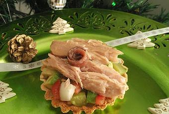 Rellenar las tartaletas con las verduras picadas y encima ponemos la ventresca de bonito y anchoas. Ponemos echar unas gotas de aceite de la lata de anchoas que le dan muy buen sabor.