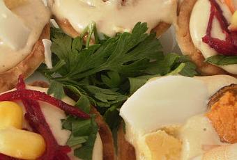 Escurrir una lata de atún en un colador, presionando para que no quede prácticamente aceite.Cortar cebolleta en trocitos muy pequeños.Preparar una mayonesa (En el vaso de la minipimer poner un huevo, una pizca de sal y aceite de oliva virgen, dándole a máxima potencia hasta conseguir la consistencia deseada)Mezclar el atún, la cebolleta y la mayonesa y repartir la salsa en las tartaletas, decorándolas al gusto. En ésta ocasión puse mejillones cocidos (pueden usar natural enlatado), langostinos cocidos, trozos de atún, anchoa, zanahoria y remolacha en conserva, maíz, huevo duro, pepinillo o cualquier producto al gusto….derrochando imaginación y combinando como deseen) Si me preguntan ¿Qué menú prepararás en Navidad? Responderé lo que siempre digo: “Papas fritas y huevo”……