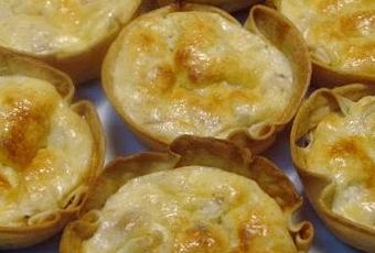 - En un molde para magdalenas engrasado, colocar 8 obleas para empanadilla pequeñas; rellenar con la masa preparada, echar un poco de queso rallado encima de cada una y hornear unos 30´, hasta que esté cuajado. Al final, gratinar un poquito para que coja color.