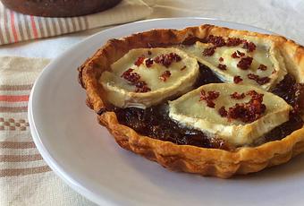 El último paso es rellenar las tartaletas. Ponéis la cebolla confitada en el fondo de la tartaleta, encima las lonchas de queso de cabra y lo metéis en el horno sólo con el gratinador, para deshacer un poco el queso.
