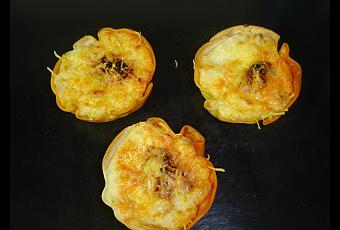 5º Para preparar los nidos utilizamos un molde como el de la foto. De esta forma, forramos el molde para las tartaletas con papel vegetal y cubrimos con la masa para empanadillas y rellenar cada tartaleta con la mezcla de coliflor y bechamel. Encima de cada tartaleta poner como una cucharada de postre de sobrasada. Cubrir con el queso rallado y cocer en el horno a 180º solo por abajo durante 15/17 minutos. A la hora de servirlos, será recomendable que estén tibios.