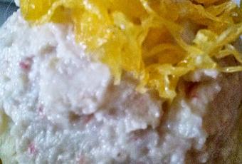 tartaletas de hojaldre pequeñas ( si lo prefieres volavanes )huevo hilado1 lata de atún en aceite de oliva8 palitos de cangrejo1 huevo duro150 g. de gambas 4 cucharadas de mahonesa