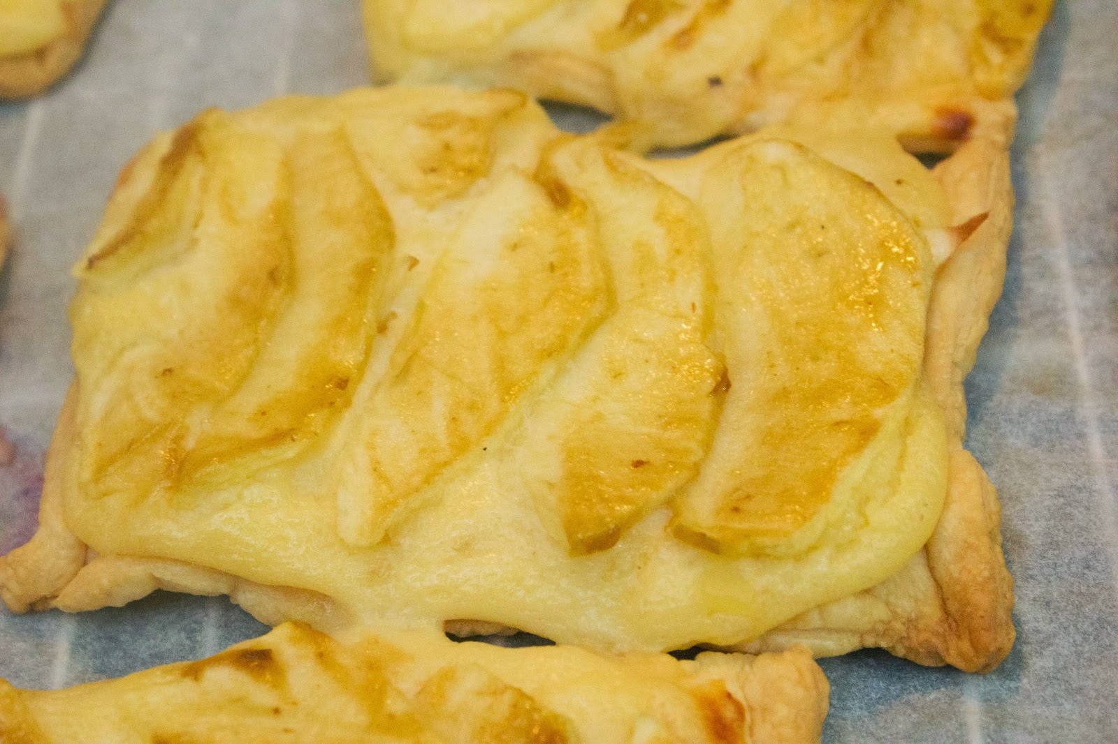 Corta la manzana en rodajitas finitas y mete en el horno 15 minutos el hojaldre. Yo a los 5 minutos lo saqué y pinche con un cuchillo un poquito porque se habían hinchado.