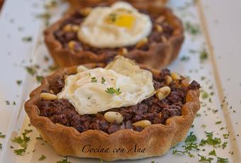 Rellenar las tartaletas con la mezcla y mantener calientes; mientras freir los huevos de codorniz y poner un huevo sobre la morcilla de cada tartaleta.