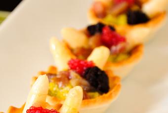 Rellenar las tartaletas con una base de crema de espárragos, poner encima dos tallos de espárragos blancos (o trigueros), unos trozos de atún ahumado, un poco de tapenade y un detalle de huevas.