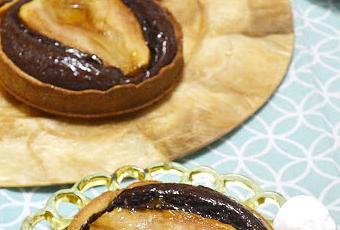 - Sacamos las tartaletas de la nevera y repartimos el relleno de chocolate sobre la masa. Colocamos las peras y las presionamos ligeramente sobre la crema.
