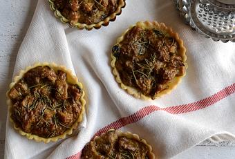 1- Precalentamos el horno a 180º C. Limpiamos y troceamos las setas. Picamos la cebolla. En una sartén, con un poquito de aceite, freímos la cebolla hasta que comience a cambiar de color, añadimos las setas y las salteamos durante 10 min. a fuego medio.2- Añadimos la nata, el curry y salpimentamos, cocinamos a fuego lento hasta que la nata reduzca y tengamos una salsa espesa.3- Forramos nuestros moldes de las tartaletas con la masa brisa. Repartimos en ellas la salsa de setas, decoramos con un poco de romero y horneamos unos 30 min. o hasta que la masa comience a dorarse. Sacamos del horno y con cuidado del molde y dejamos enfriar encima de una rejilla metálica.