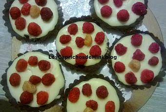 Masa quebrada de cacao: 200 g. de harina, 40g, de cacao puro en polvo, una pizca de sal, un poquito de cayena molida o pimienta rosa (opcional pero interesante aporte), 80 g. azúcar, 150 g. de mantequilla fría (recién sacada de la nevera) cortada en cuadraditos, 2 cucharadas de aguardiente muy frío (opcional)Crema de mascarpone y chocolate blanco: 300 g de chocolate blanco, 200 ml. de nata para montar , 100 g. de mantequilla, 250 g. mascarpone.Frambuesas rojas y blancas para decorar.Elaboración:Masa quebrada: en un bol ponemos la harina, el cacao, la cayena en polvo y la sal, mezclar todos los ingredientes bien. Añadir la mantequilla muy fría cortada en pequeños cuadrados con los dedos vamos mezclando rápidamente la mantequilla y el resto de ingredientes , poco a poco se irán formado como una especie de migas a medida que la mantequilla se va fundiendo.Para que la masa quede crujiente dejar trozos de mantequilla sin deshacer.Hacer una bola, envolver en film transparente y dejar 30 minutos en la nevera, para que se endurezca un poco.Sacar ,estirar con un rodillo , darle la forma del molde o moldes, si es para los vasitos hacer un circulo .Precalentar el horno, cocer a 170º en ciego 15 minutos, es decir poner unas legumbres encima para que la masa no suba, y luego otros 15 para dorar.Dejar enfriar antes de desmoldar. Reservar.Elaboración crema mascarpone: poner la nata en un cazo, llevar a ebullición, cuando hierva retirar del fuego, fuera del fuego agregamos el chocolate blanco y la mantequilla troceados. Remover bien hasta obtener una crema brillante y lisa, sin grumos, añadir el mascarpone a temperatura ambiente , con una espátula envolver bien con el chocolate hasta que este totalmente integrado.Aquí viene la diferencia en función de la presentación:Tartataletas o tarta: una vez que la masa quebrada de chocolate esta totalmente fría y la hemos desmoldado vertemos sobre ella la crema de mascarpone , la metemos en la nevera para que al enfriarse tome consistencia.Decorar antes de servir.Vasitos: trituramos con los dedos la masa quebrada de chocolate y vamos poniendo como base en los vasitos encima vertimos un poco de crema de mascarpone, dejar enfriar en la nevera. Decorar antes de servir.Es laborioso para que negarlo, pero no lleva tanto tiempo como podemos creer .Podemos decorar con fresas, kiwi, moras, mandarina.Es aconsejable utilizar papel vegetal para estirar la masa quebrada.