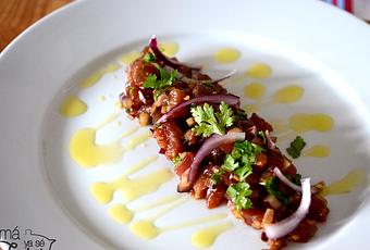 El tartar de atún, a diferencia del steak tartar, tiene muchas interpretaciones y muchas recetas. Generalmente todas tienen las misma base: cebolla picada, salsa de soja y algún aceite (oliva o sésamo). Yo creo que la clave está en elegir pocos ingredientes, darle mucho protagonismo al atún y combinar bien los sabores. Para mí es imprescindible que este presente el salado, un poco de ácido, picante y a veces me gusta con un toque dulce.