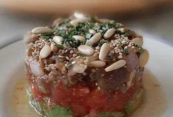 Emplatar, poniendo una capa de aguacate, otra de tomate y el tartar, poner un chorrito de aceite de sésamo por encima (optativo) y decorar con el resto del sésamo, piñones y el cebollino picado muy fino.
