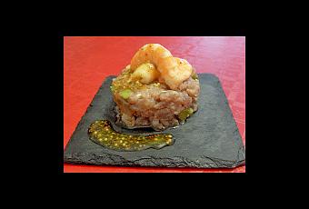 Emplatar: con un molde cilíndrico, rellenar con la mezcla, adornar con un par de langostinos y añadir por encima y a un lado un poco de vinagreta.
