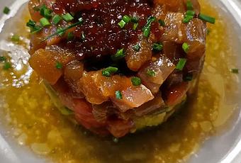 2 rodajas de atún congelado 3-4 cucharadas soperas de salsa de soja s/a 1 cucharada de salsa de pescado (optativo) 1 cucharada sopera de aceite de sésamo (optativo) 1 cucharadita pequeña de wasabi (o al gusto) Semillas de sésamo para decorar Aceite de oliva virgen extra Pelar y picar los tomates y el aguacate, aliñar con sal, pimienta y aove y reservar.