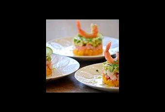 Lavamos y picamos el perejil y mezclamos con 6 cucharadas de aceite y 3 cucharadas de lima, pimienta y sal. Limpiamos la cebolla y la picamos muy picadita, los langostinos los escaldamos durante 30 segundos en agua hirviendo, los escurrimos y los refrescamos en agua fría. Reservamos un para para decorar, y el resto lo pelamos y picamos y aliñamos con 3 cucharadas de la vinagreta preparada. Vaciamos el aguacate y lo picamos en dados, mezclamos con 1 cucharada de cebolla y 2 de vinagreta y removemos. Retirar el hueso del mango y lo picamos tambien en dados, colocaremos un aro en los platos y los rellenaremos primero con un base de mango, y después con una de langostinos y por último una de aguacate. Decoramos con los langostinos enteros que reservamos, aliñamos con el resto de la vinagreta y lo servimos.
