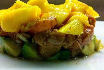 Una capa de aguacate , el salmon con su marinado y por ultimo el mango .