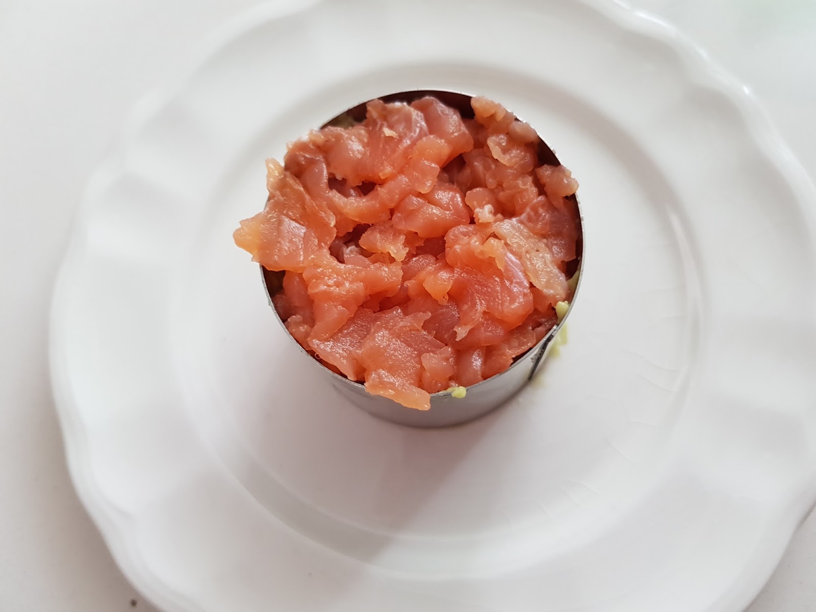 5. - Y vamos montando en un aro de emplatar , yo hice uno cuadrado y uno redondo,ponemos primero la mezcla de aguacate...