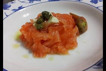 Elaboración:Cortar el salmón en trocitos pequeños, mientras hacemos la vinagreta para ello batimos el trozo de mango con el limón y el aceite de oliva virgen extra y la pizca de sal. Una vez batido lo mezclamos en un bol con el salmón ahumado.Ahora ya nos queda decorar para ello ponemos el salmón en el plato y encima ponemos el queso cortado en dados pequeños, una pizca de albahaca y dos alcaparras encima, en un lado ponemos el tomate cherry cortado por la mitad.